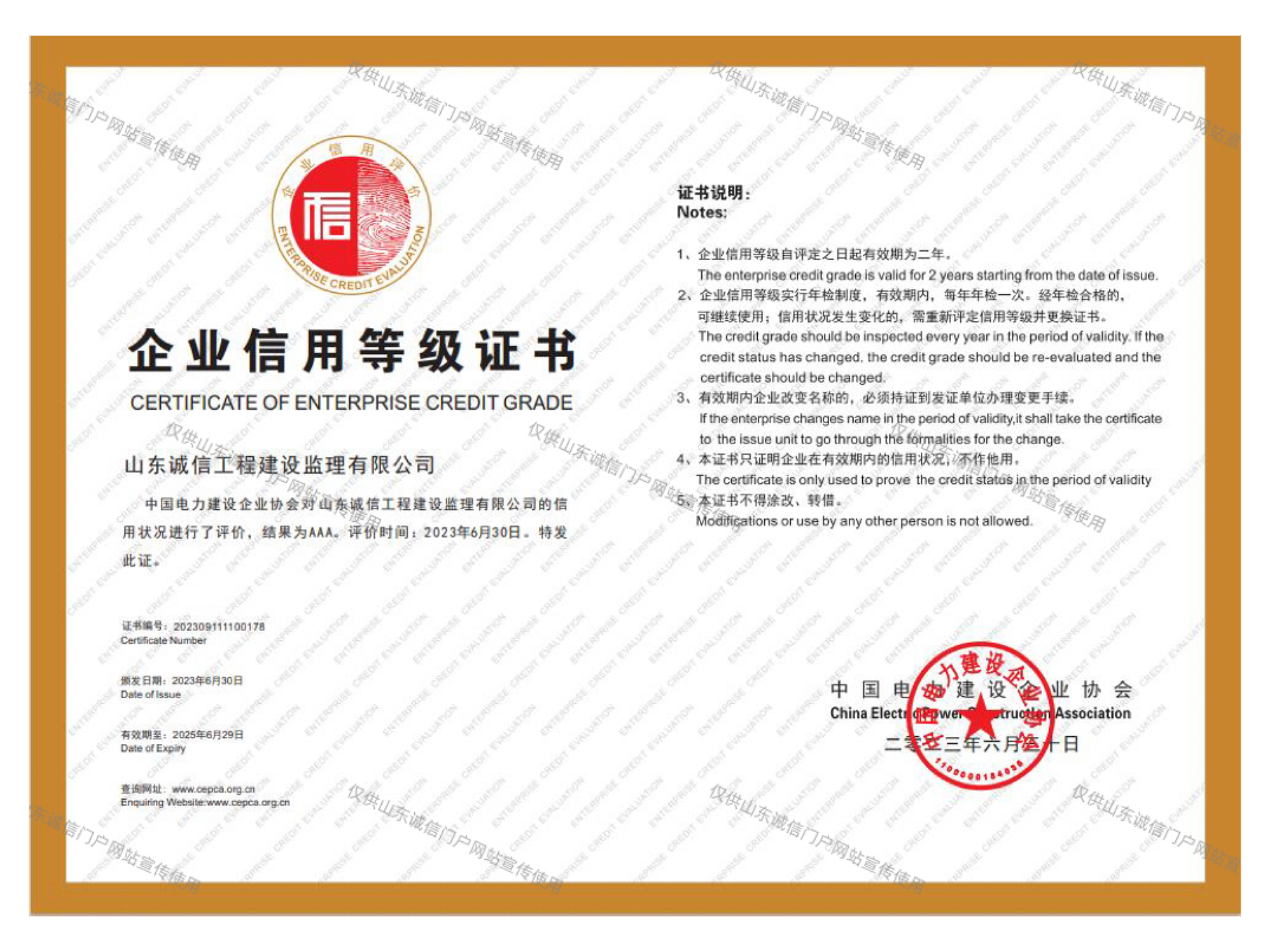2、中国电力建设企业协会AAA级企业信用等级证书